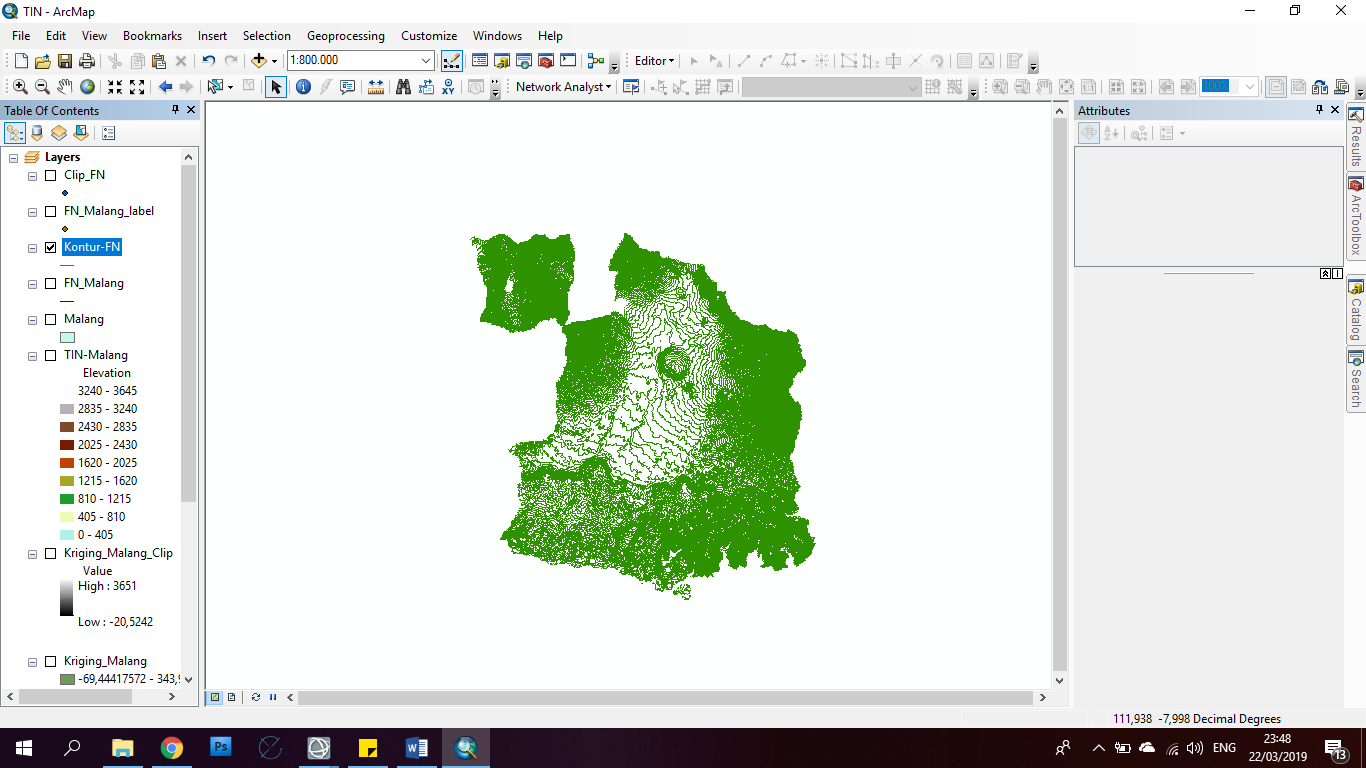 d. Untuk membuat kontur, data titik tersebut harus diubah menjadi data raster. Dapat menggunakan tools Krigging yang merupakan interpolasi ketinggian dari titik-titik yang sudah diketahui ketinggiannya. Klik Arctoolbox > 3D Analyst Tools > Raster Interpolation, pilih Krigging. Pada menu tabel Krigging masukkan input point features dengan layer yang telah terisi data ketinggian > Lalu klik OK. Outputnya akan seperti gambar dibawah ini